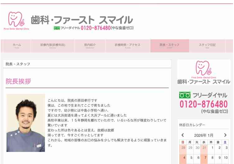 「ファーストスマイル」という名前からして、なんとなく明るい雰囲気のクリニックを想像しますが、実際、医院のサイトも丁寧な作りで、信頼感を打ち出していた印象です。